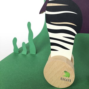 Vous recevrez un okapi en bois de hêtre et sa fiche informative illustrée dans une jolie boîte noire mat.