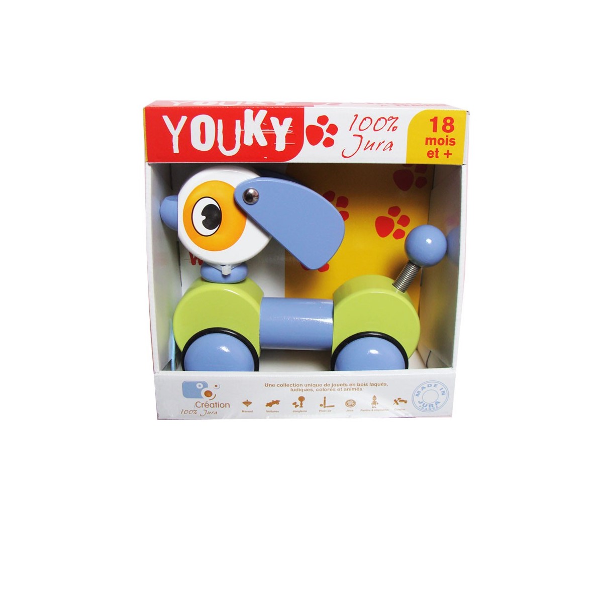 Fabriqué en France par un artisan du Jura, le jouet à tirer - Youki le petit chien bleu est un animal très rigolo qui accompagnera votre enfant dans toutes ses aventures !