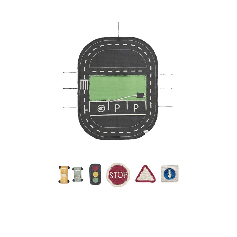 Chargez votre voiture et partez ! Un jeu en textile qui stimule l'imagination et le jeu interactif. Ce canevas gris foncé comprend des accessoires faits main : un feu de circulation, un panneau stop, un panneau céder le passage, un panneau flèche, un chargeur de voiture et deux voitures. Il comporte également une route imprimée, un carrefour et un parking.
