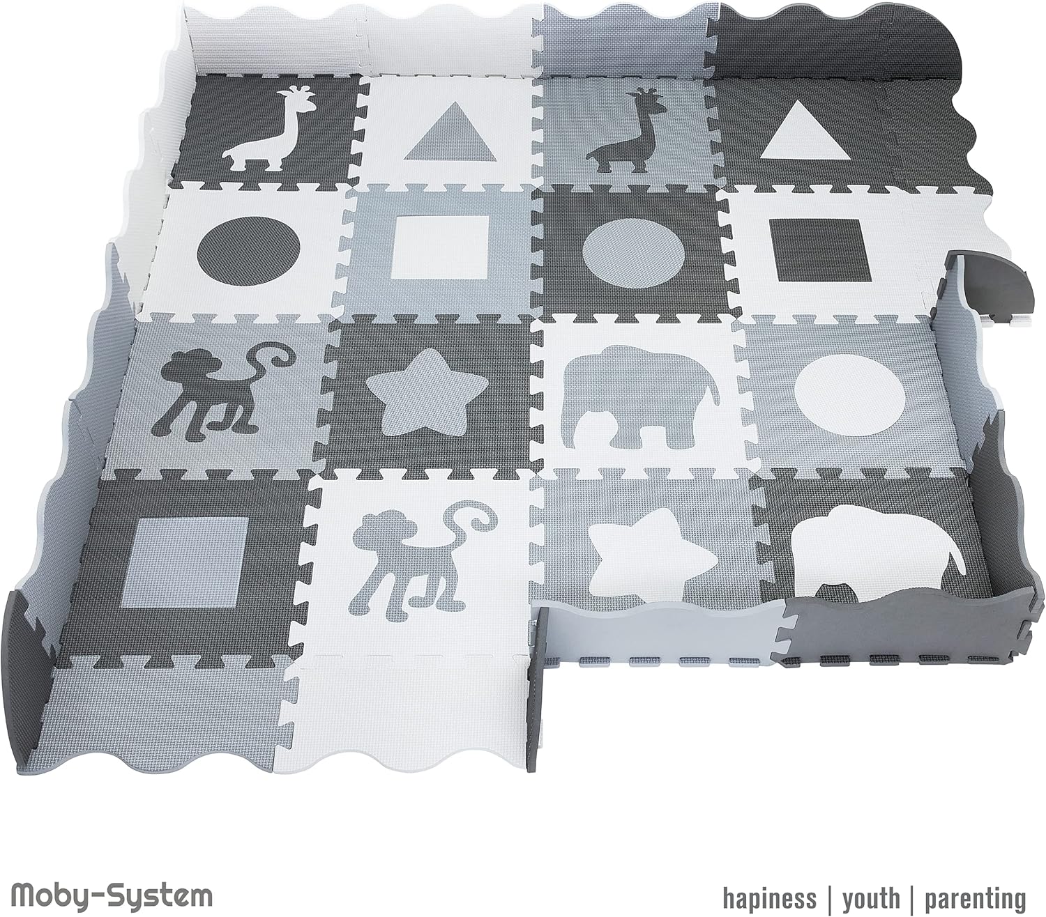 Tapis puzzle 150 x 150 cm, idéale pour bébés à partir de 0 âge, enfants et adultes. Composé de 16 pièces avec une taille d’environ 32 x 32 cm la pièce. La bordure est aussi composée de 16 pièces.