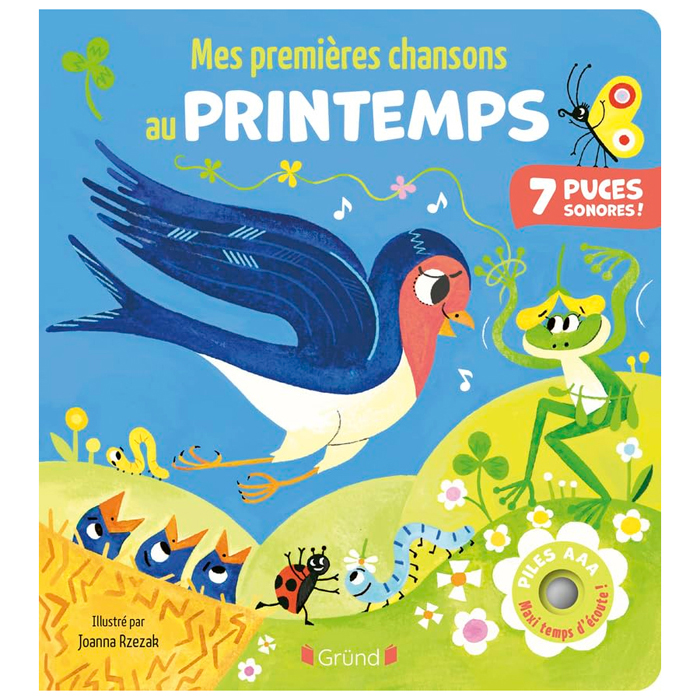 - C'est le printemps ! Découvre au fil des pages de cet ouvrage sonore 7 chansons incontournables pour célébrer cette saison : "C'est le printemps" d'Henri Dès ; "Petit ver de terre" ; "Dans ce jardin" ; "Pipi sur le gazon" ; "Mars arrive" ; "Y'a un coucou" ; "Itsy bitsy spider".