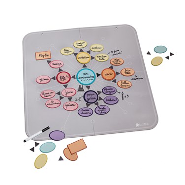 Ce plateau vous permet de pratiquer le mind-mapping au quotidien. Que ce soit dans le domaine personnel, éducatif ou encore professionnel, les applications sont nombreuses : un exposé à réaliser, une leçon à assimiler, la préparation d’un examen, l’organisation d’un projet au travail ou encore celle d’un anniversaire… Mettez votre thème au centre et posez toutes vos idées associées sous forme de dessins et de mots-clés. Vous créez ainsi une arborescence naturelle et structurée de toutes vos pensées. Et comme tout est magnétique et effaçable, vous les arrangez et réarrangez facilement et simplement. Mind Map est pour toute la famille et il s'adapte à tous les sujets ! Seul ou à plusieurs, place à la réflexion et au partage d’idées !