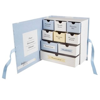 Une boîte à tiroirs pour conserver les souvenirs de bébé ! Complètement originale, cette boîte composée de neuf tiroirs à remplir de souvenirs de votre petit garçon. Le coffret baby boy est le cadeau de naissance idéal pour ne jamais oublier les premiers moments de l'enfant.