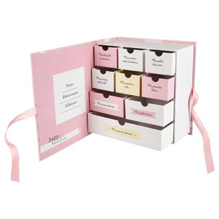 Une boîte à tiroirs pour conserver les souvenirs de bébé ! Complètement originale, cette boîte composée de neuf tiroirs à remplir de souvenirs de votre petite fille. Le coffret baby girl est le cadeau de naissance idéal pour ne jamais oublier les premiers moments de l'enfant.