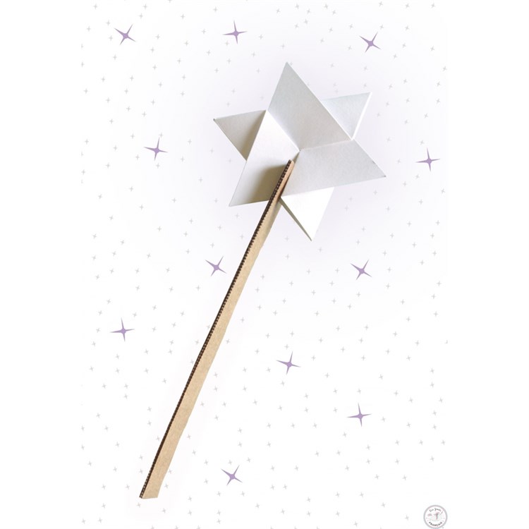 L'enfant doit mettre en volume l’étoile en pliant le papier et, muni de ses crayons, la décore avec les couleurs de son choix. Il n'y a plus qu’à glisser l'étoile au bout de la baguette en carton... et le tour est joué