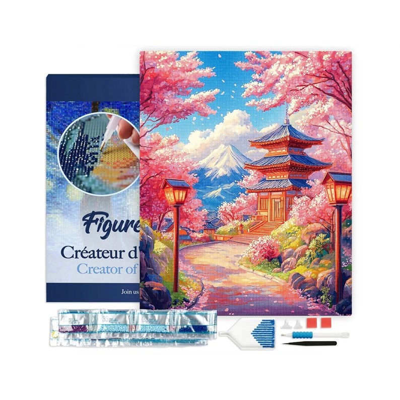 ?? Réalisez un tableau zen avec ce kit de Broderie Diamant 40x50cm – Route des Cerisiers en Fleurs vers la Pagode . Toile premium montée sur châssis, diamants carrés et accessoires inclus. Détente créative et décoration raffinée garanties.