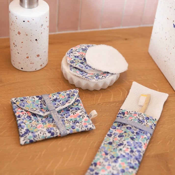 Avec ce kit, vous allez réaliser deux accessoires pratiques & utiles à glisser dans votre trousse de toilette. Un étui pour ranger 1 ou 2 brosses à dents et une pochette contenant 4 lingettes lavables en microfibre de bambou/Liberty Fabrics. Ces deux accessoires sont totalement imperméables et entièrement doublés en nid de puce (mini ni d’abeille). Vous allez vous même imperméabiliser le tissu Liberty Fabric grâce à un super produit : l’Odicoat. Bonne couture ??