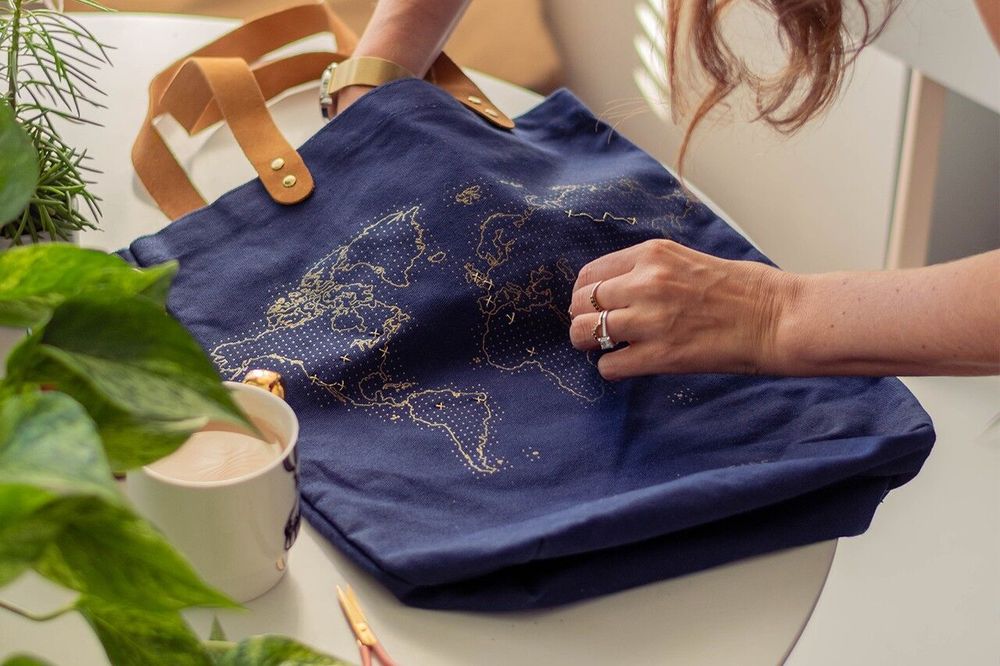 Belle toile bleu marine imprimée en or avec la carte du monde, ce sac fourre-tout est également livré avec une aiguille et du fil de voyage que vous pouvez utiliser pour enregistrer vos voyages dans le monde. Piquez des croix, des flèches ou des cœurs en broderie point de croix pour marquer les endroits que vous avez visités!