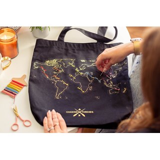 Ce magnifique sac en toile noire est peut-être encore notre préféré... imprimé en or avec la carte du monde, ce sac fourre-tout est également livré avec une aiguille et du fil de « voyage » que vous pouvez utiliser pour enregistrer vos voyages dans le monde. Vous pouvez broder des croix , des flèches ou des cœurs pour marquer les endroits que vous avez visités !
