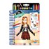 Ce kit contient 4 crayons de couleurs, 4 feutres double-embouts, 24 pastilles de peinture, 1 pinceau, 1 pochoir, 1 planche de stickers, 2 planches de motifs adhésifs, 1 feuille de papier pailleté adhésif, 2 feuilles de tissus adhésifs et 1 carnet de 28 pages épaisses dont 4 pages de tenues à colorier et 24 pages de silhouettes à habiller.