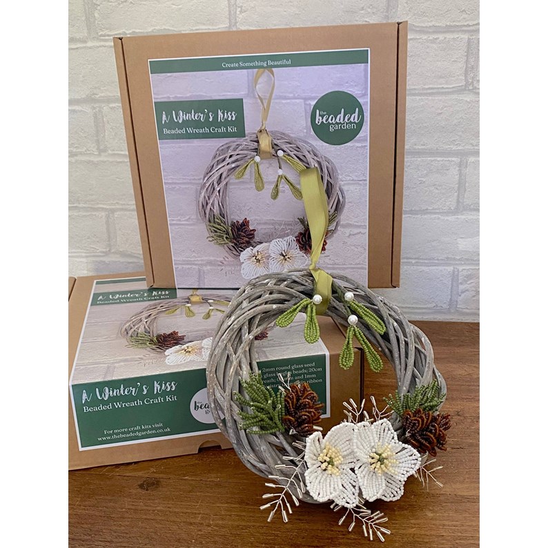 Un kit de création de couronnes de fleurs perlées Winter's Kiss. Remarque : cette couronne n'est pas adaptée pour être conservée à l'extérieur par temps humide. Un kit de couronne Winter's Kiss comprend deux roses de Noël blanches, deux pommes de pin et des branches d'aiguilles de pin, des sprays de gui et de fougère argentée. Votre kit contiendra : 1 couronne de saule mesurant 20 cm plusieurs petits sachets de perles de rocaille de taille 11/0 (2 mm) et de perles de clairon de 6 mm fil de fleuristerie vert et argenté ruban suspendu comment emballer avec des instructions et des illustrations étape par étape Vous aurez besoin de pinces coupantes pour ce projet. Les outils ne sont pas inclus. La boîte mesure 25 x 25 x 7,5 cm et pèse 500 g.