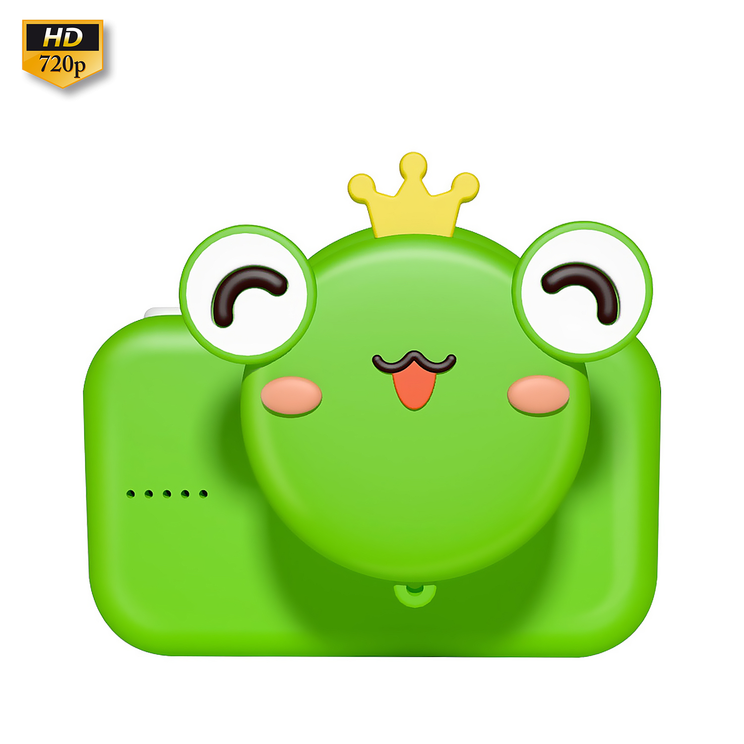 Appareil photo et vidéo pour enfants A1. Conception de grenouille. 20mpx et vidéo HD. Caméra arrière pour selfies. • Photos jusqu'à 20mpx et enregistrement vidéo HD. • Lecture vidéo et visionneuse de photos, jeux de réflexion, prise de vue en continu, retardateur, etc. • Les modes photo et vidéo comportent des scènes et des cadres photo. Les enfants peuvent choisir leur scène ou leur cadre préféré avant de prendre la photo. • Avec une caméra arrière avec laquelle les enfants peuvent prendre des selfies plus facilement. • Comprend des autocollants pour décorer l'appareil photo, le cordon de transport et le capuchon d'objectif avec un design personnalisé.