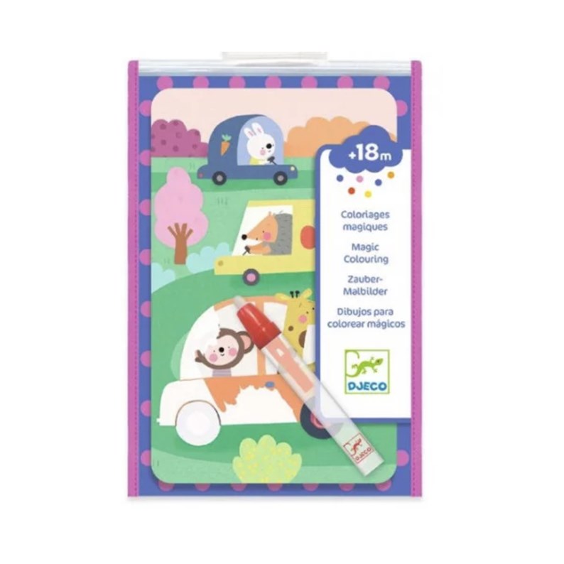 Découvrez le coloriage à l'eau En route de Djeco, une activité de coloriage originale pour les enfants dès 18 mois, qui vont s'amuser à colorier des illustrations avec de l'eau. Un coloriage magique car les couleurs se révèlent lorsque votre enfant passera son crayon dessus. Votre enfant s'amusera à colorier les parties blanches, afin de faire apparaitre de belles couleurs et de jolis motifs. Ensuite, faîtes sécher et recommencez! 4 tableaux souples avec des animaux rigolos dans une fusée, dans un avion, dans un sous-marin ou encore dans des voitures. Une première activité de coloriage, à faire et à refaire autant de fois que l'on veut, avec un gros crayon adapté aux petites mains des enfants dès 18 mois.