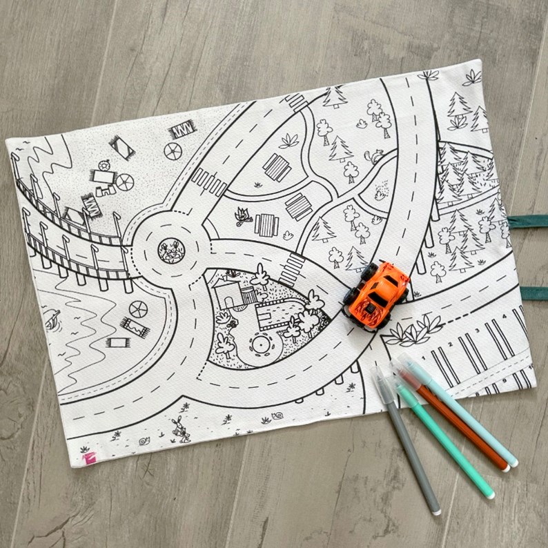 \nLe set de table s'emporte partout ! Il est idéal pour occuper son enfant : dans une salle d’attente, au restaurant , lors d’un dîner de famille . Une fois colorié, le tissu se lave facilement à la machine à laver (30 ou 40°C) ou à la main pour une nouvelle utilisation.