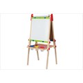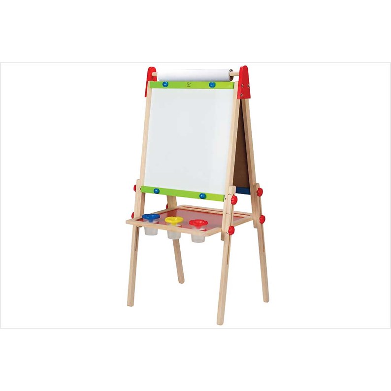 Grand tableau 3 en 1 Hape : une face noire à la craie, une face blanche magnétique pour le feutre effaçable et un rouleau de papier. Les pieds sont réglables en hauteur. Tableau livré avec un rouleau de papier, 3 pots en plastique et 4 aimants.