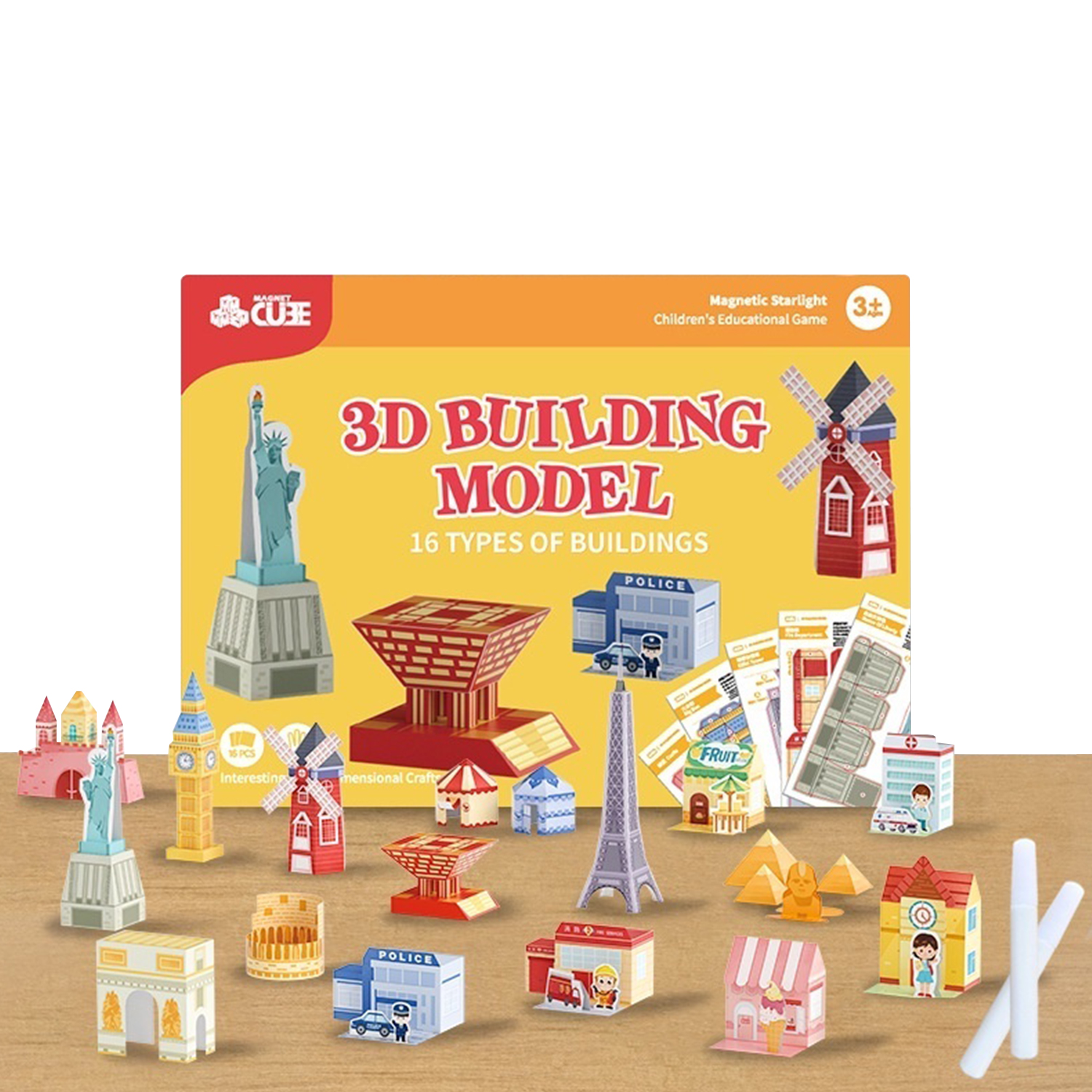 Kit de bricolage 3D en papier ORIGAMI. Contient 16 figurines : * Big Ben * Colisée romain * Moulin à vent des Pays-Bas * La couronne orientale * Tour Eiffel * Statue de la Liberté * Arc de triomphe * Commissariat de police * Caserne de pompiers * Magasin de glaces * Hôpital * Château * École * Pyramide * Magasin de fruits * Mongol Yourte Pour les adultes, elle contient deux petites bouteilles de colle adhésive. Dossier détachable à décor plat pour jouer avec vos personnages.