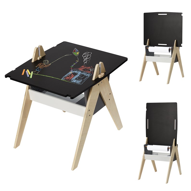 Ce bureau très polyvalent s'adapte parfaitement aux différentes activités créatives des enfants, et il est complètement modulable afin de suivre l'enfant dans son développement. Il suffit de placer la tablette du bureau en position verticale pour profiter d'un tableau à deux faces : une surface en ardoise et une surface tableau blanc effaçable et aimanté pour jouer. La tablette peut être utilisée indépendament du bureau et suivre l'enfant dans ses activités. Elle est également munie d'un rouleau de papier idéal pour dessiner et laisser libre-cours à son imagination.