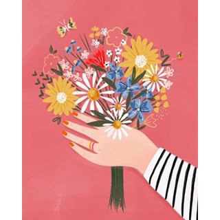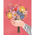 Apportez une touche florale et joyeuse à votre décoration avec la peinture par numéros Joy! ""Bouquet Bohème"" . Ce modèle représente une main élégante tenant un bouquet champêtre composé de marguerites, tournesols, myosotis et fleurs des champs sur un fond rose éclatant. Un design moderne, pop et poétique qui illuminera n’importe quelle pièce.