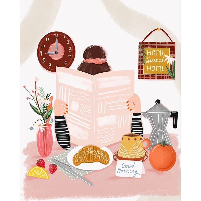 Commencez la journée avec douceur grâce à Petit Déj' Douillet , notre peinture par numéros représentant une scène matinale pleine de charme : une femme savourant son petit-déjeuner, croissant, café, fruits et lecture du journal, le tout dans une ambiance cocooning ""Home Sweet Home"".