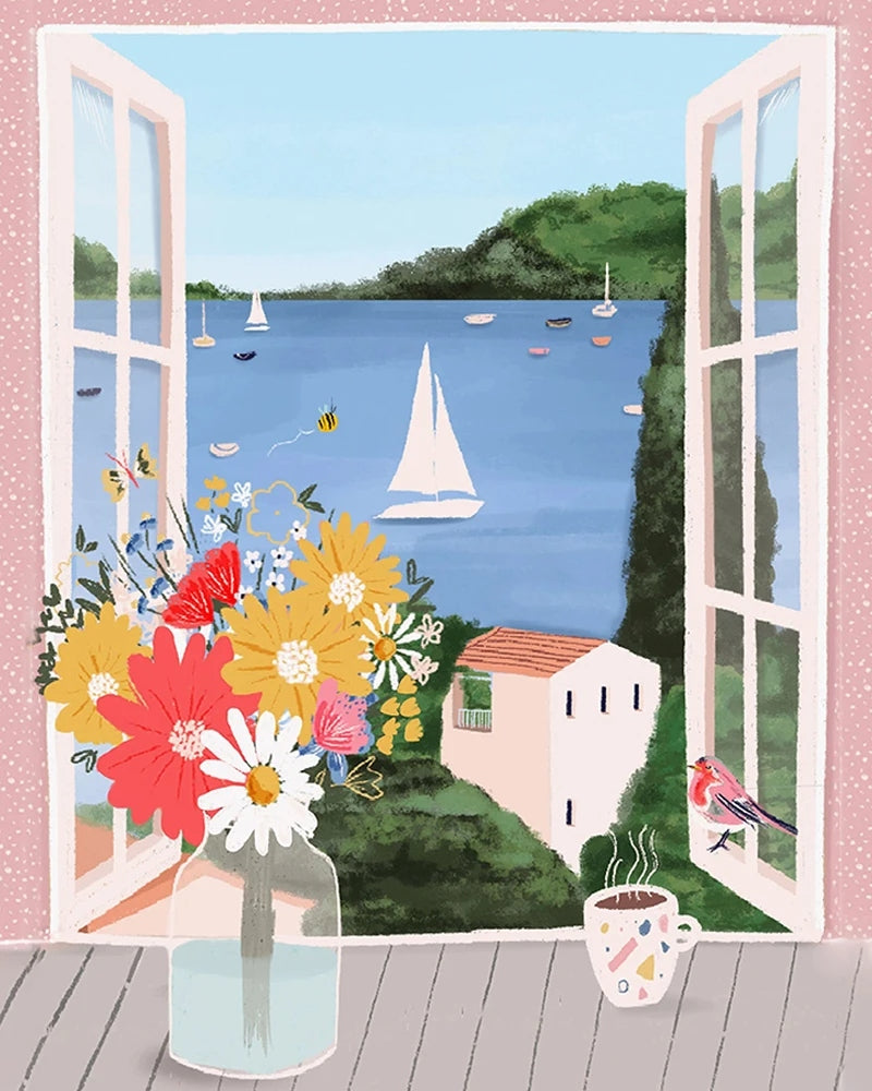 Offrez-vous une parenthèse de créativité et de sérénité avec notre peinture par numéros ""Évasion Florale"" . Ce modèle enchanteur vous transporte dans un univers bucolique : une fenêtre grande ouverte sur un lac paisible où voguent des voiliers, entourée de collines verdoyantes. Un joli bouquet de fleurs fraîches, une tasse de café et un oiseau perché sur l'appui de fenêtre complètent cette scène douce et apaisante.