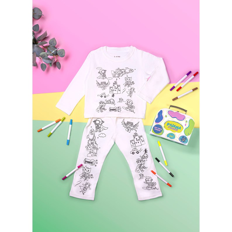 Kit complet : Accompagné de 10 feutres à tissu non toxiques, ce pyjama permet aux enfants de dessiner et de personnaliser leurs icônes de super héros, leur donnant le pouvoir de créer l'uniforme de leurs rêves.