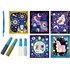 Ce kit créatif permet de réaliser de beaux tableaux magiques qui brilleront dans la nuit grâce au sable phosphorescent. Pour cela, il suffit de décorer les cartes en soulevant la partie prédécoupée avec l'outil prévu à cet effet puis de saupoudrer de paillettes et de sable. Votre enfant suit les modèles du livret et met à l'épreuve sa motricité fine et sa concentration pour décorer les cinq tableaux autocollants. Une activité créative qui apporte calme, concentration et apaisement.