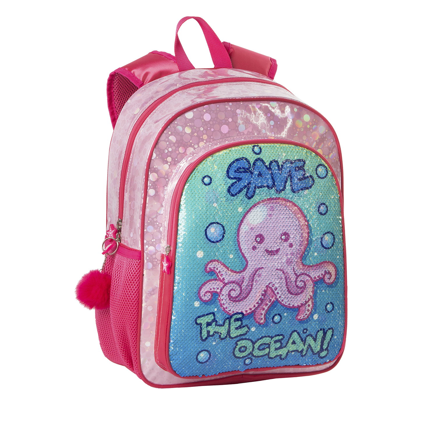 Sac à dos primaire Pulpito Save The Ocean : • Matériaux brillants très amusants. Empiècement à paillettes réversible. • Intérieur entièrement doublé. • Dos rembourré. Bretelles ergonomiques, réglables et rembourrées. Finitions et fermetures éclair de haute qualité. Bonne sensation tactile. • Résistant et spacieux. • Adaptable à la voiture. • Avec accessoire pompon.
