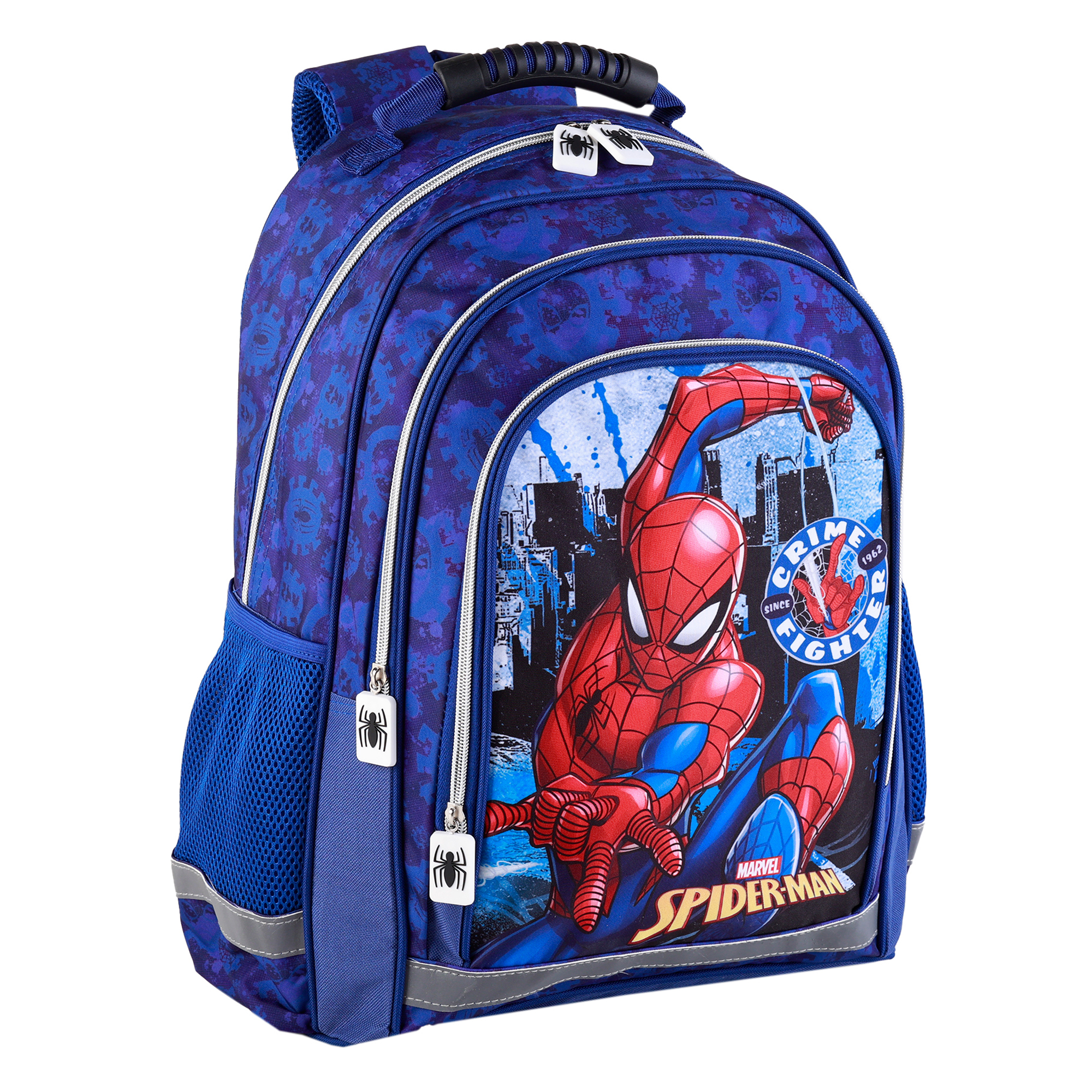 Sac à dos Spiderman à double compartiment adaptable à la voiture. Matière polyester. Dos et bretelles ergonomiques, doublés et rembourrés. Poignées personnalisées. 2 poches latérales.