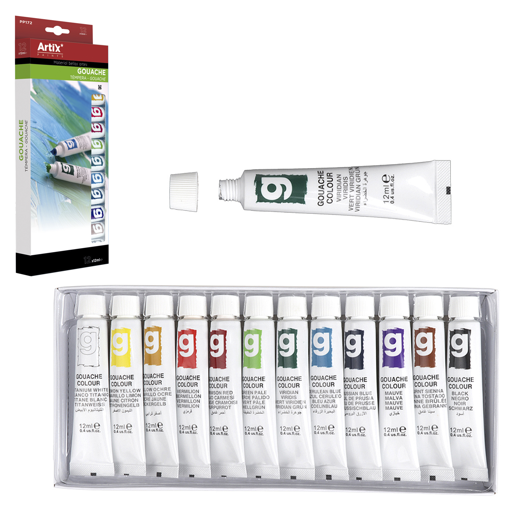 • Étui de 12 tubes de 12 ml en couleurs assorties.