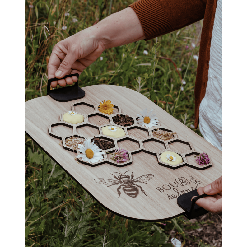Plateau recto-verso. Sur la face avant, découvrez une abeille soigneusement gravée ainsi que 20 alvéoles pour proposer des activités de transvasement ou de numération. Au dos, découvrez le cycle de vie de l'abeille, grâce aux jetons. L'occasion d'évoquer avec l'enfant 4 stades différents de développement de l'abeille.