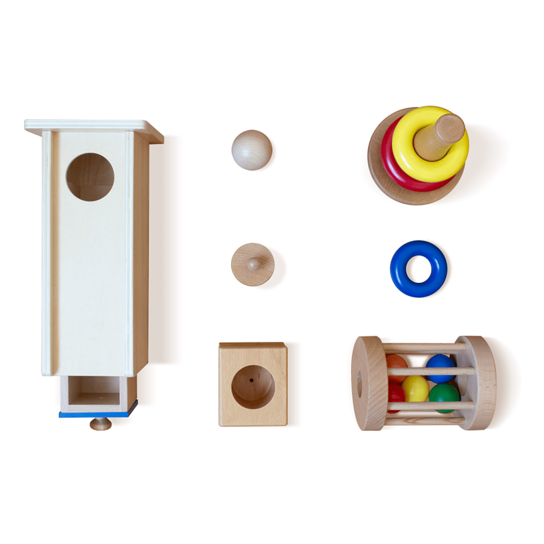 • Une boite à permanence de l’objet : avec ce matériel, l’enfant travaille sa coordination œil-main et expérimente le fait qu’un objet continue d’exister même s’il ne le perçoit plus.