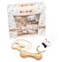 Le coffret a été imaginé pour solliciter les cinq sens de bébé de façon douce et naturelle. La vue est attirée par les formes arrondies et les tons neutres du crochet. Le toucher est enrichi par le contraste entre le bois lisse et la texture du coton. L' ouïe est éveillée par les sons légers générés lors de la manipulation. L' odorat est respecté grâce à l'utilisation de matériaux bruts et non traités. Et enfin, le goût entre en jeu avec l'anneau de dentition en bois naturel, parfait pour soulager les gencives lors des premières poussées dentaires.