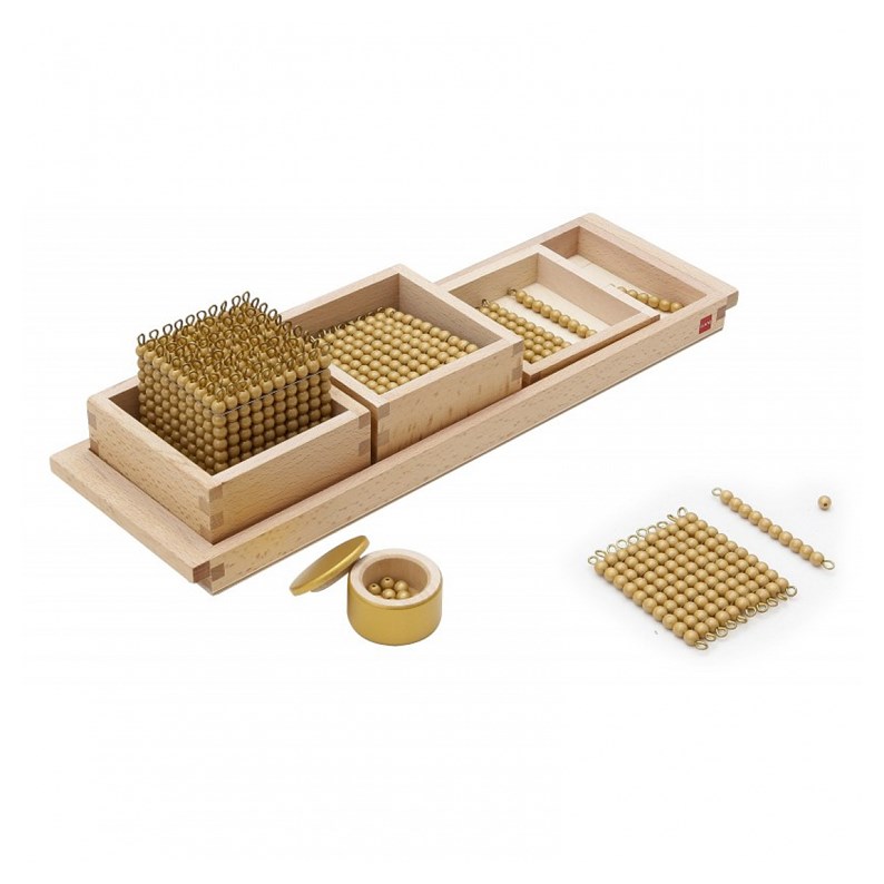 Une représentation concrète du système décimal de 1 à 1000, qui démontre la valeur de position et le concept selon lequel une catégorie décimale ne peut pas dépasser 9. L'ensemble comprend : 9 perles unitaires individuelles, 9 barres de 10, 9 carrés de 100, 1 cube de 1000. , 3 caisses en bois, 1 plateau unitaire en bois et un plateau en bois.