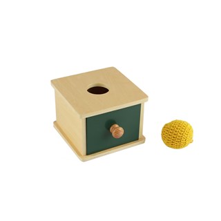 Avec cette boîte, le travail de l'enfant sera de placer la balle en crochet, plus molle que la boule rouge de la précédente boîte de la progression Montessori, dans la fente prévue à cet effet. Lorsqu'il y arrive, la balle disparaît dans la boîte. Et surprise, lorsqu'il ouvre le tiroir, il se rend compte que la balle est toujours là. Il apprend donc la notion de permanence et que les choses existent indépendamment de son regard.