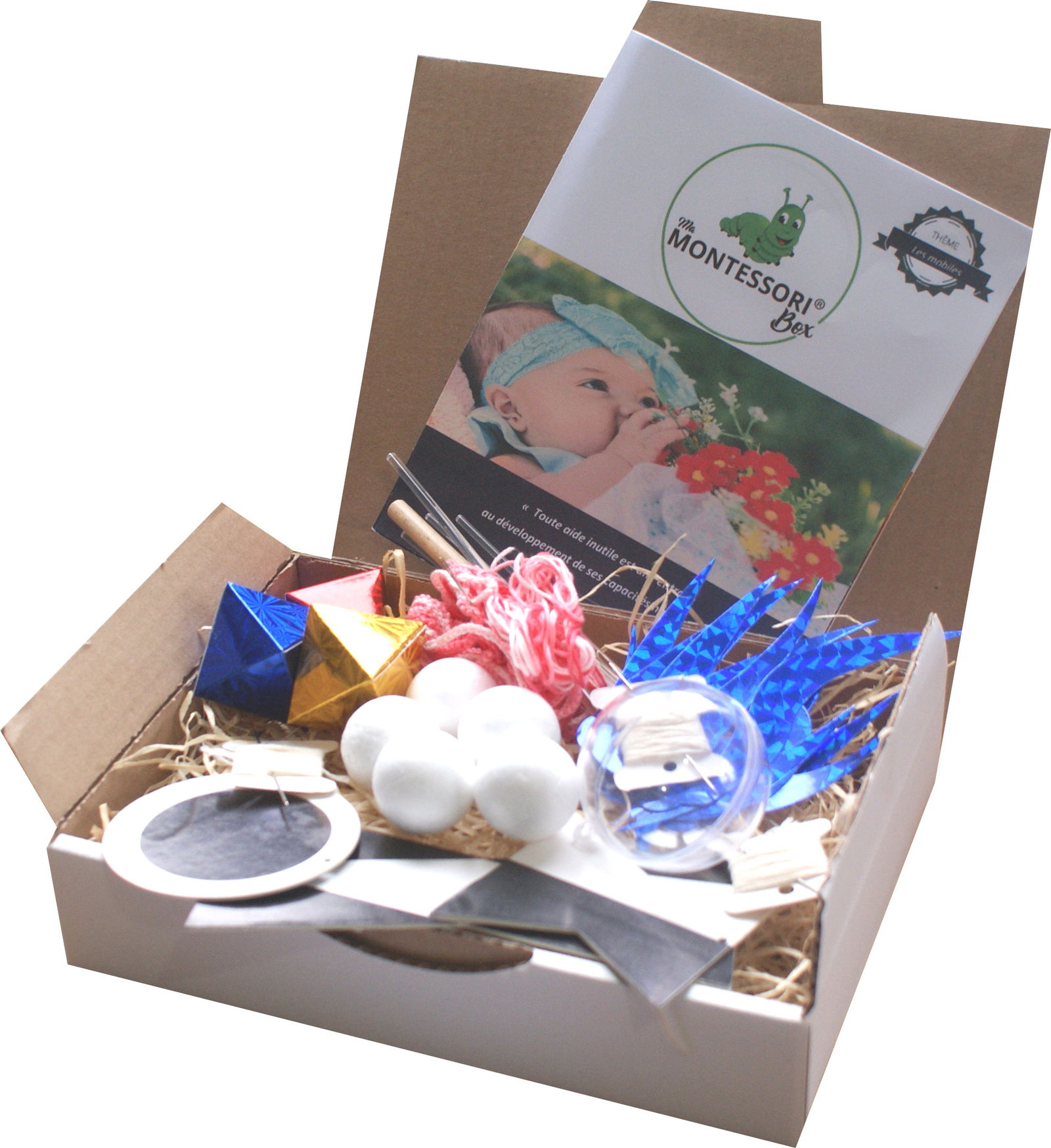 Ce coffret inédit regroupe les 4 mobiles Montessori à assembler pour éveiller les bébés de 3 semaines à 4 mois environ.
