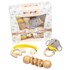 Le coffret a été imaginé pour solliciter les cinq sens de bébé de façon douce et naturelle. La vue est attirée par les formes arrondies et les tons neutres du crochet. Le toucher est enrichi par le contraste entre le bois lisse et la texture du coton. L' ouïe est éveillée par les sons légers générés lors de la manipulation. L' odorat est respecté grâce à l'utilisation de matériaux bruts et non traités. Et enfin, le goût entre en jeu avec l'anneau de dentition en bois naturel, parfait pour soulager les gencives lors des premières poussées dentaires.