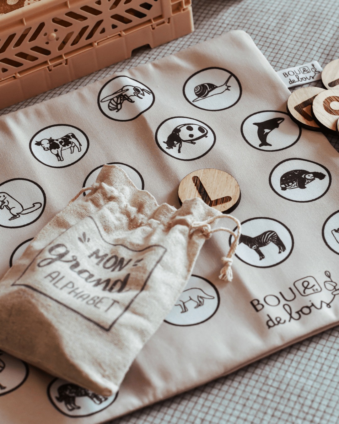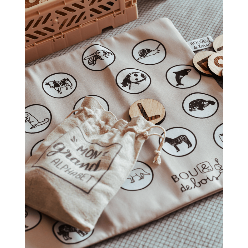 Le tapis d'activités est recto-verso. D'un côté il y a les lettres de l'alphabet, sur lesquelles l'enfant pourra placer le jeton avec la lettre correspondante. De l'autre, l'enfant va découvrir la notion de son d'attaque et associer le jeton avec la lettre correspondante (par exemple : le A sur l'illustration de l'Abeille, B sur Biche, C sur Coccinelle...).