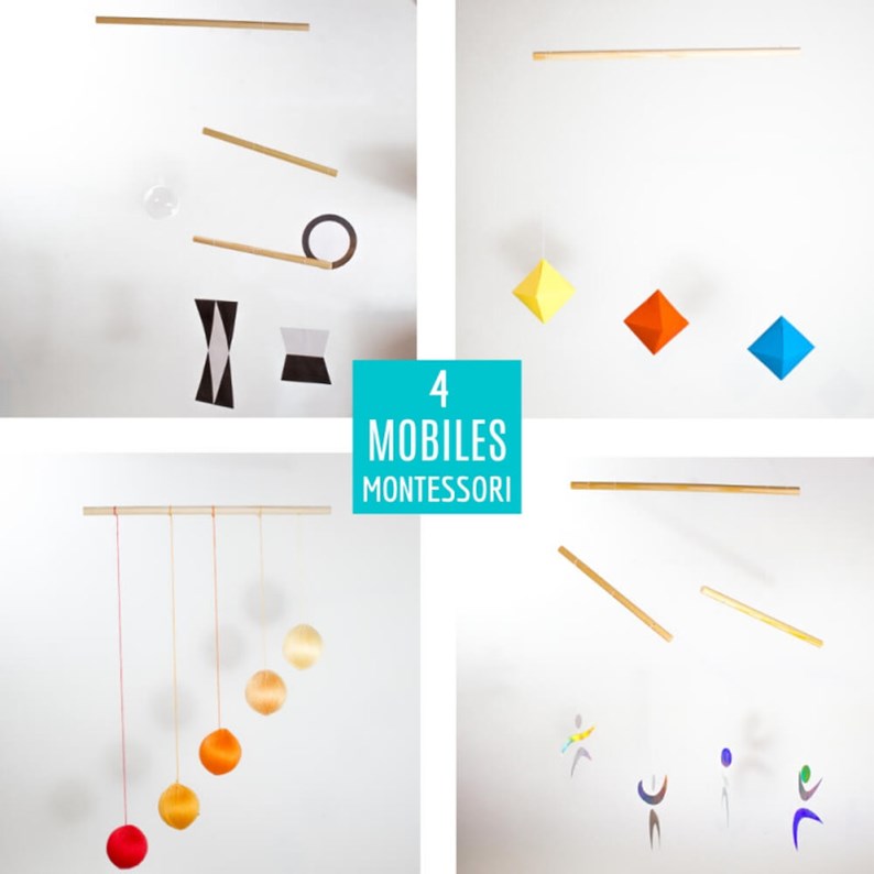 La box contient les 4 mobiles préconisés par maria Montessori :