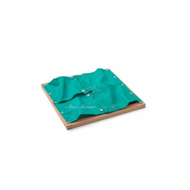 Fidèle à la pédagogie Montessori, le tissu est séparé en deux et les quatre rectangles de tissu sont fixés sur les 2 cotés du cadre (et non pas enroulés autour!).