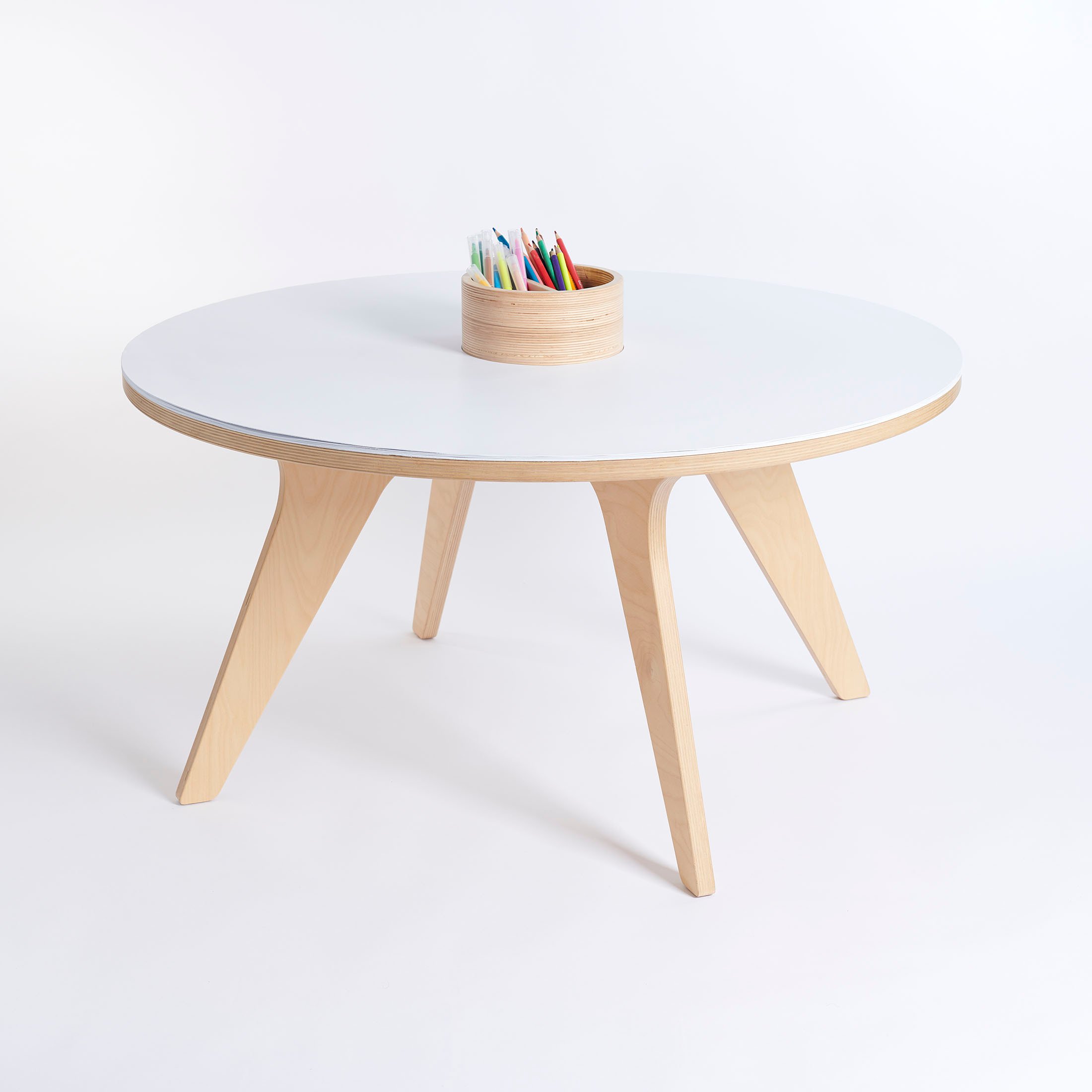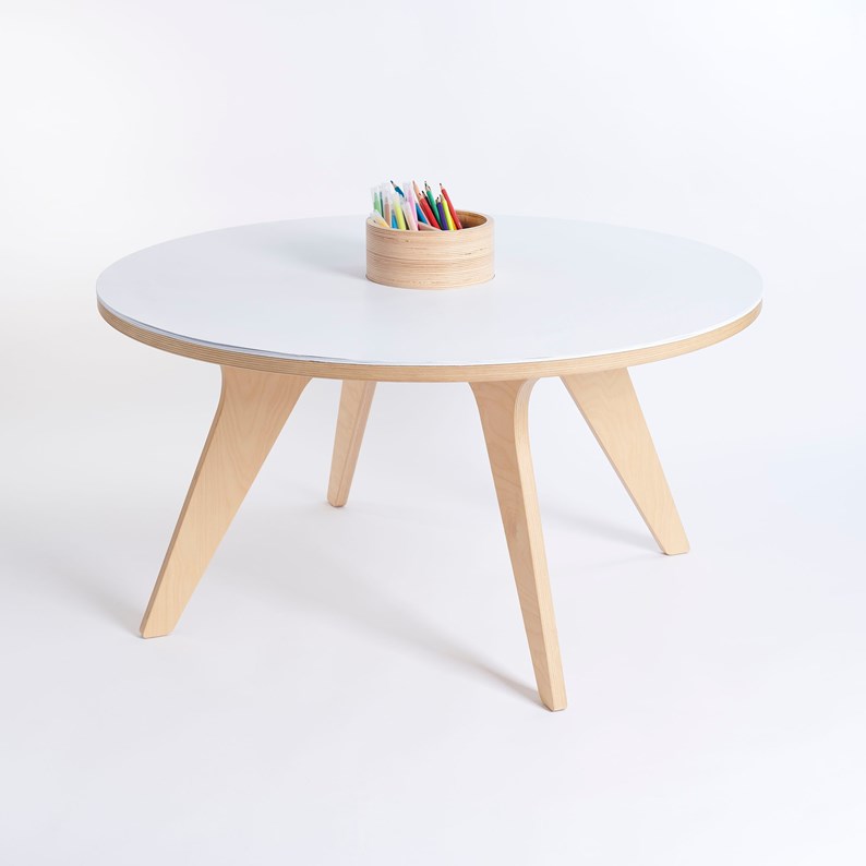 A leur hauteur (H48cm), circulaire pour jouer avec les autres, et surtout intelligente! Les accessoires (craies, crayons de couleur, marqueurs) se trouvent au centre de la table ronde (attention ils ne sont pas compris dans la table) . Les différentes feuilles blanches ainsi que le tableau réversible intégré peuvent être retirés pour faire place à une jolie table ronde.