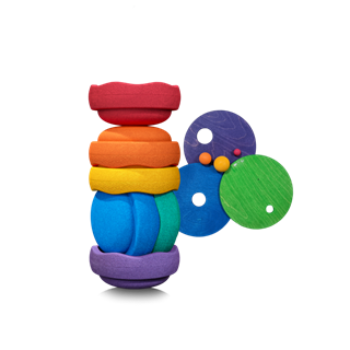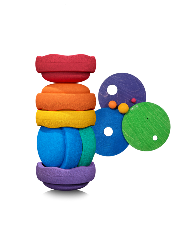 Cet Set se compose de : trois disques en bois avec trois tailles de trous différentes, trois boules en bois de trois tailles différentes et six éléments Stapelstein® Original dans les couleurs de l'arc-en-ciel classic ou pastel. Les disques et les boules sont parfaitement assortis à nos couleurs inspirées du Bauhaus.