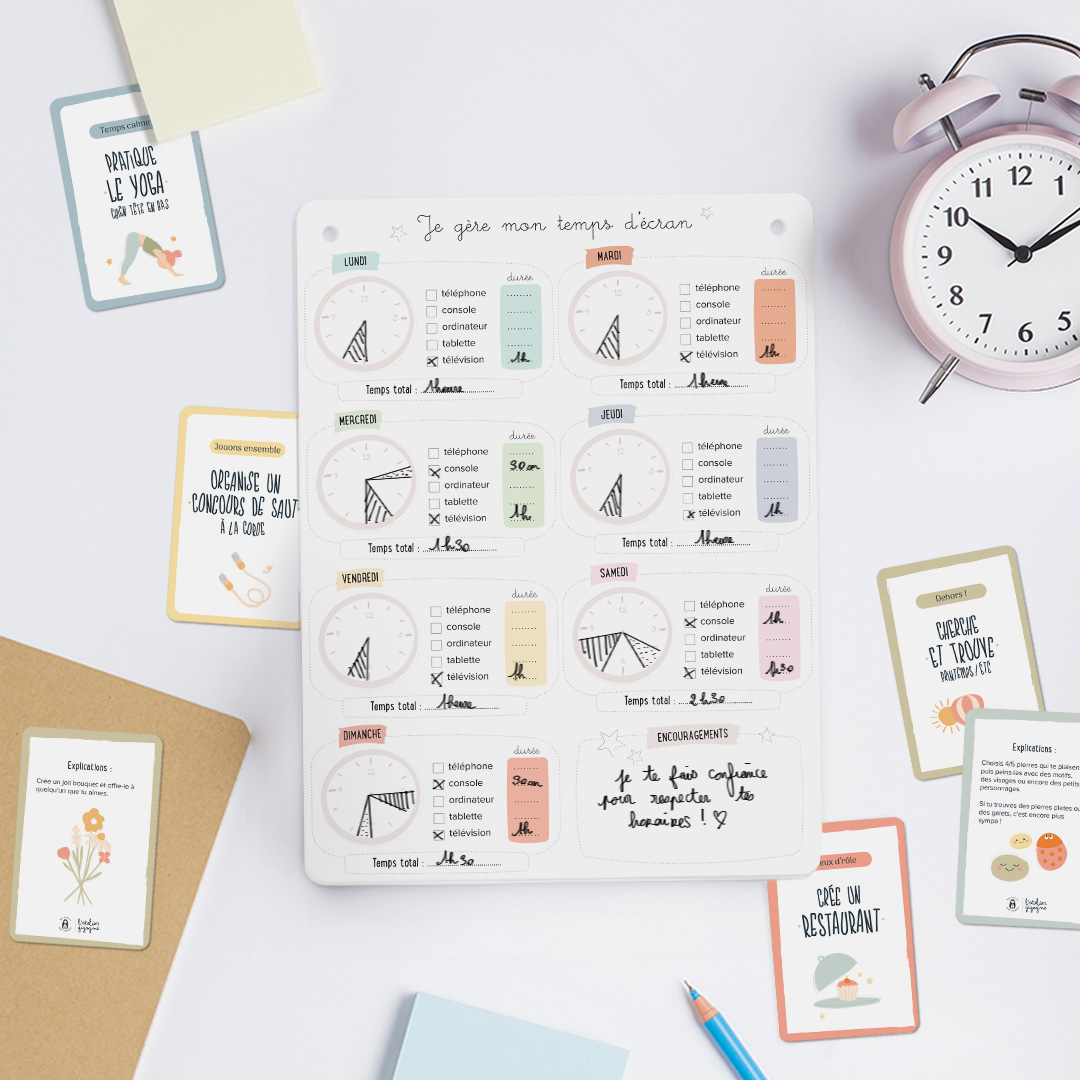 Une fois le temps d’écran écoulé, pas question de s’ennuyer ! Votre enfant pourra piocher parmi les 30 cartes activités réparties en 5 thèmes : “atelier bricolo”, “temps calme”, “dehors”, “jeux d’rôle” et “jouons ensemble”.