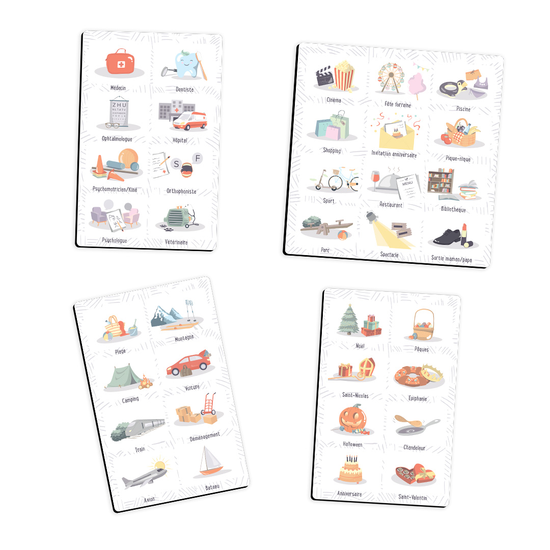 Placez les magnets sur un tableau ou une surface métallique pour représenter les activités à venir ou les moments clés de la journée. Votre enfant peut ainsi identifier les soins, les sorties, les voyages ou les fêtes, ce qui facilite la compréhension des routines et encourage sa participation active dans l’organisation du quotidien.