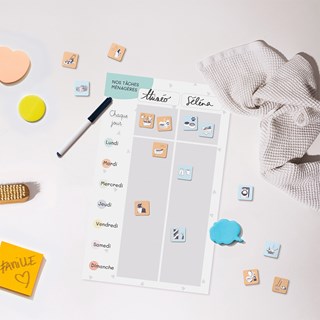 Ces magnets, très astucieux, permettent de répartir les tâches ménagères au sein du foyer : 1 personne, 1 couleur ! Un excellent moyen d’apprendre aux enfants à participer à la vie quotidienne.