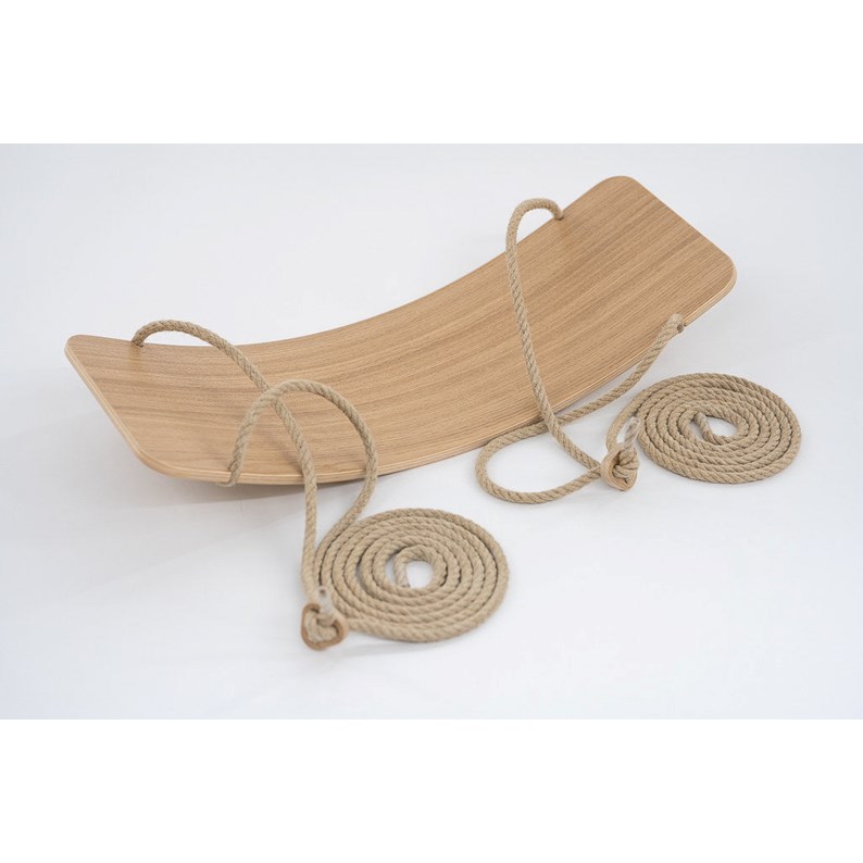 - Pour l’utiliser comme balançoire : Fixez la corde en chanvre à votre plafond et insérez-la dans les fentes spécialement prévues à cet effet, situées aux deux extrémités de la planche. Relevez la planche, ajustez la longueur de corde et profitez pleinement de la balançoire ! Vous pouvez être certain qu’elle sera l’endroit préféré de la maison, tant pour les enfants que pour les adultes !