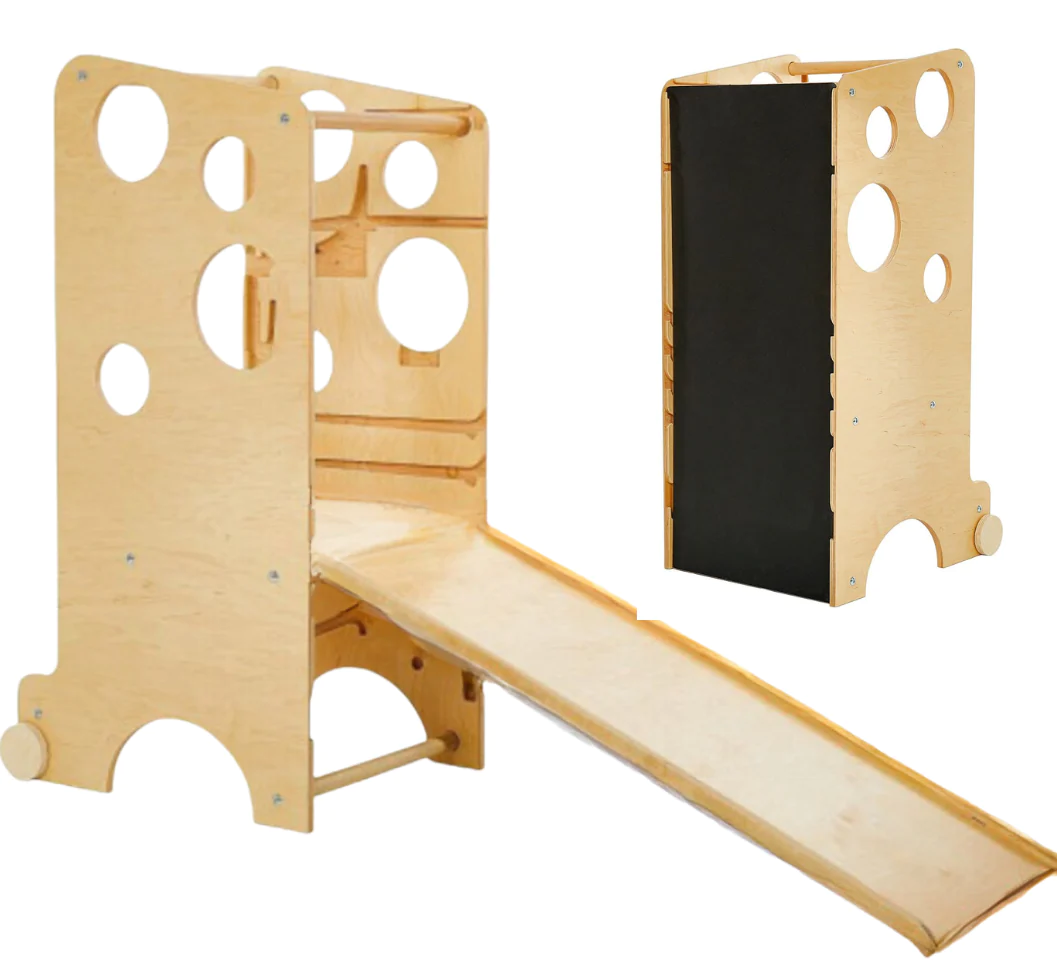 5-en-1: Tour, bureau, chaise haute, toboggan, ardoise
