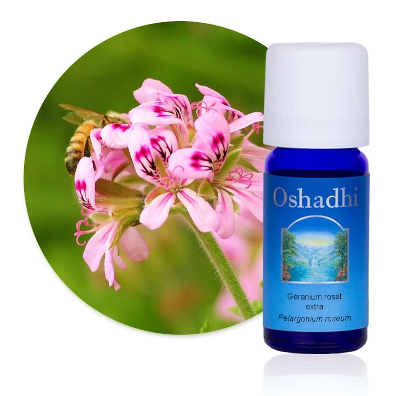 Description botanique : Il existe plusieurs variété de ""géraniums"" aromatiques, parmi lesquels nous ""élirons"" le Géranium rosat. Il est cultivé (entre autres) au Maroc, on distille ses feuilles, et son HE possède cette fragrance très agréable, douce, fleurie, aux notes de Rose. Elle est utile comme anti-spasmodique, relaxante, anti-inflammatoire, mais aussi tonique doux au niveau nerveux, cutané, veineux, hépatique et pancréatique. Elle a également une action intéressante comme anti-infectieux et anti-fongique pour la peau.