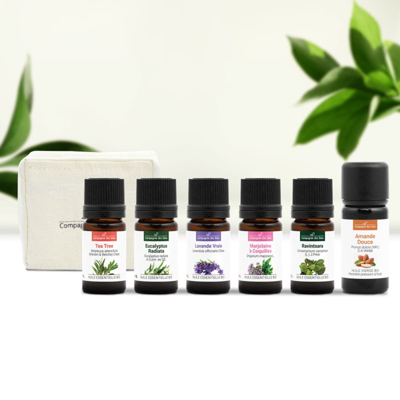 Huiles essentielles BIO de Lavande Vraie, Marjolaine à Coquilles, Ravintsara, Tea Tree, Eucalyptus Radiata + Huile Végétale BIO d'Amande douce + Trousse en coton non traité