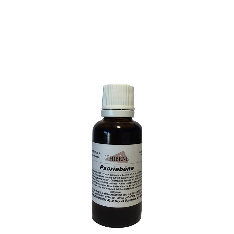 « Psoriabêne»Nous vous proposons une combinaison d'huiles essentielles et végétales afin de soulager les démangeaisons, les rougeurs et la desquamation liées au psoriasis, ce soin peut s’adapter sur n’importe quelle partie du corps du cou jusqu’aux orteils, à l’exception des yeux. Il est fortement conseillé d’utiliser ce soin durant 21 jours de s’arrêter 5 à 7 jours et de reprendre surtout lorsque les gênes reviennent et de se masser sur la zone au minimum 2 fois par jour. Ce soin naturel sera peut être à faire durant plusieurs mois en fonction de chacun…La Myrrhe a des propriétés cicatrisantes remarquables. Le nard de l’himalayaa des propriétés calmantes, harmonisantes mais elle est aussi très régénératrice pour la peau et particulièrement pour le cuir chevelu. Elle combat les allergies et est un bon décongestionnant veineux. Elle est aussi bénéfique en cas de chocs émotionnels. La myrte a des propriétés toniques et astringentes pour la peau. La camomille noble ou camomille romaine est calmante, adoucissante et soulage les démangeaisons. . La palmarosa est très utilisé dans la préparation de soins dermiques pour ses propriétés hydratantes et équilibrantes. La camomille matricaire ou camomille allemande aide à lutter contre les démangeaisons, cicatrisante, décongestionne la peau. Le géranium convient parfaitement au soin de la peau pour la detoxifier et équilibrer sa production de sébum. Le romarin est un revitalisant cutané. Le laurier noble est un antalgique et anti névralgique puissant surtout dans la synergie. Le bois de rose a des propriétés curatives pour les peaux sensibles et abimées. L'huile de noyau d'abricot est composée de 90% d’Acides Gras Insaturés. Très équilibrée, ces A.G.I. sont pour 2/3 des acides oléiques et pour 1/3 des acides linoléiques. Elle est émolliente et nourrissante. Elle convient pour les massages .Elle revitalise les peaux atones et fatiguées. Elle est régénératrice pour peaux sèches et délicates. Elle est riche en vitamines F, A et E. L’huile de calophyllum inophyllum aussi appelée aussi huile de tamanu a une action cicatrisante, anti-inflammatoire, apaisante, hydratante et nourrissante. Protecteur et régénérateur artériel et veineux, elle tonifie les parois capillaires et fluidifie le sang et est active sur la micro circulation. L’huile d’argan originaire du Maroc, riche en vitamine E et en insaponifiables, est réputée pour ses propriétés nourrissantes, régénérantes et restructurantes. Son pouvoir anti-oxydant compense en profondeur la dénutrition de la peau.Contre indications: femmes enceintes ou allaitantes, enfants en bas âgesLes actifsCe produit est 100% naturel sans conservateur sans parabèneArgania spinosa oil* Prunus armeniaca kermel oil*, calophyllum tacamahacaoil, Myrtus communis oil*,commiphora myrrha extract, Nardostachys jatamansi extract,Anthemis nobilis flower oil, Cymbopogon martinii oil* Chamomilla reticula oil*, Pelargonium graveolens oil*, rosmarinus officinalis oil*, laurus nobilis extract*, Aniba rosaedora wood oil. *Huiles essentielles ou végétales biologiques certifiées