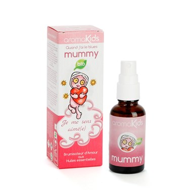 - Le spray d'aromathérapie Mummy dévoile un mélange de 6 huiles essentielles bio : lavande, bigaradier, myrrhe, ylang-ylang, bois de Hô et de l'essence de bergamote.